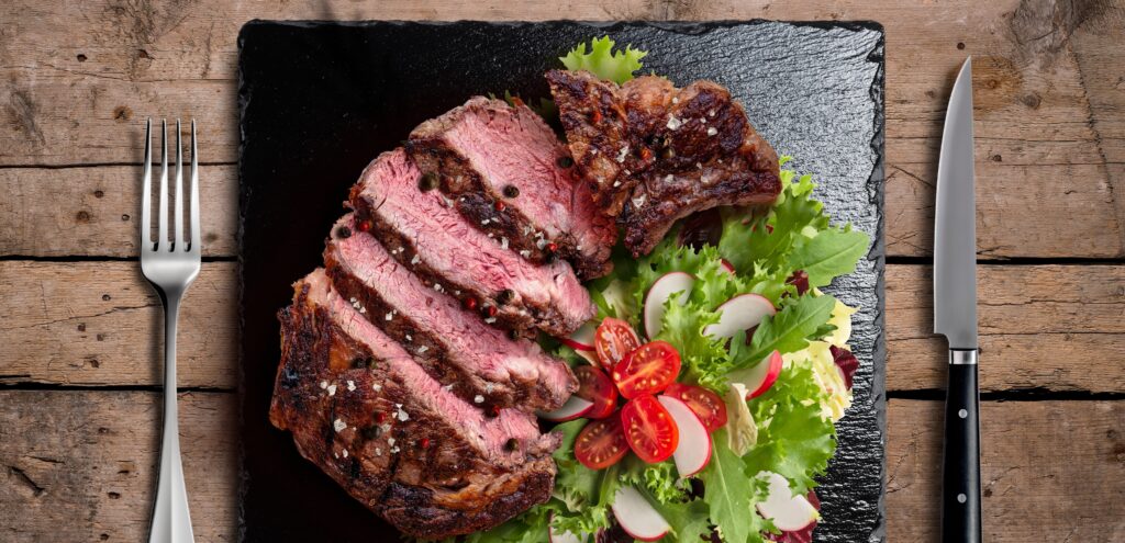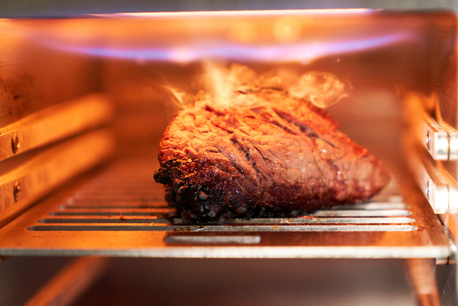 Durch die spezielle Zubereitungsweise in dem Beefer wird das Fleisch nur 1-2 Minuten bei 800 Grad gegrillt. Anschließend ruht es bei niedriger Temperatur nach. Dadurch wird es super saftig und schmilzt auf der Zunge.