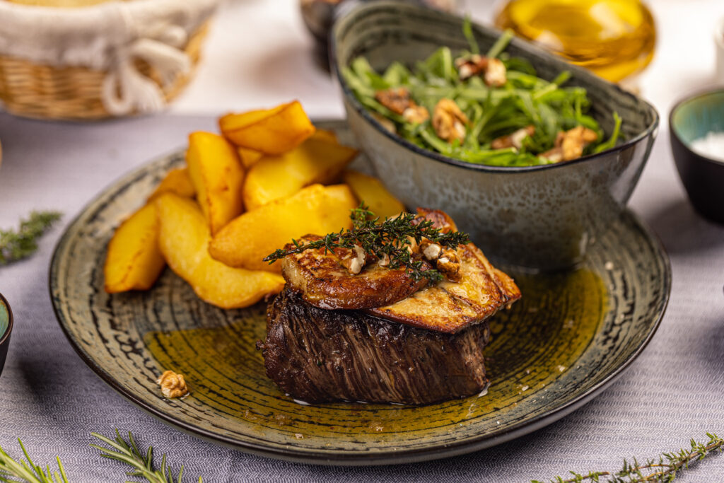 Diese Saucen und Toppings runden den Genuss ab, wählen Sie zwei davon zu Ihrem Gericht aus: Pfeffersauce | Kräuterbutter | BBQ-Sauce | Trüffel-Hollandaise