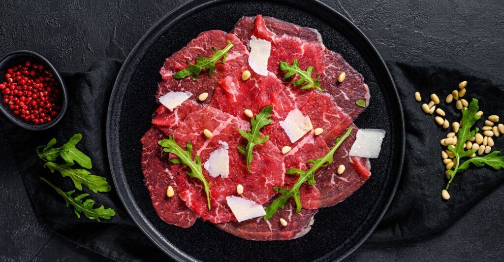 Carpaccio vom Rind Parmesan, Meersalz, Rucola und Baguette | EUR 18,00 |